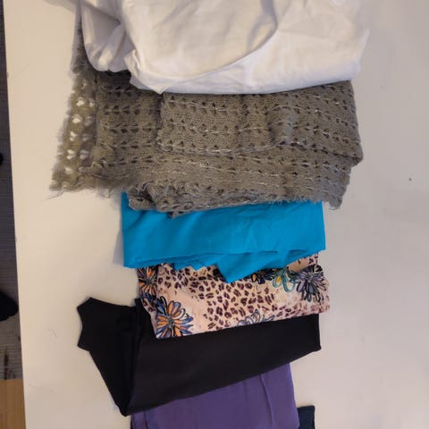 Blandet stoffer. Både jersye og et stykke fast stof.