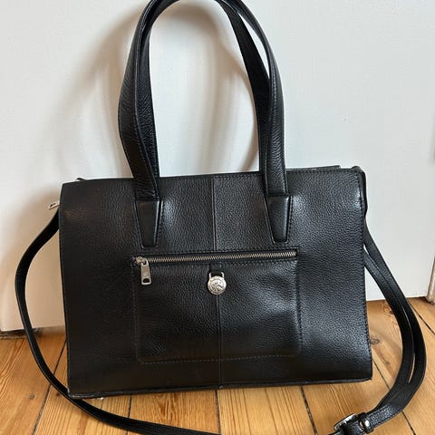 Tasken har mange gode rum med lynlås. Indeholder også en kortholder i sort læder.