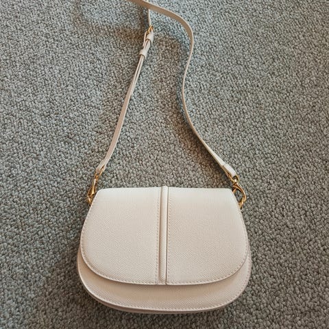 H&M shoppet taske lavet af stof, designet til kvinder. Tasken har en lynlåslomme indvendigt.