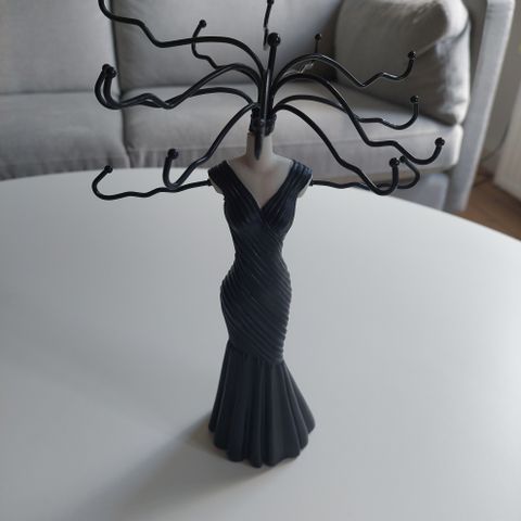 Elegant smykkestativ i form af en mannequin. Fremstillet i metal med en guldfarvet finish. Ideel til opbevaring og fremvisning af smykker som halskæder, armbånd og øreringe.