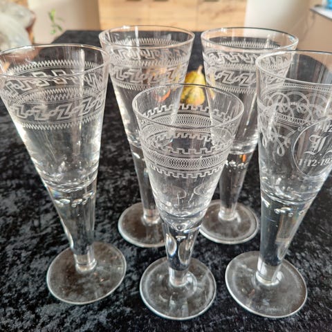 Smukt arvegods div. glaspokaler nogle med indgravering og karafler nogle fra omkring slutningen af 1800-tallet og op til 1930