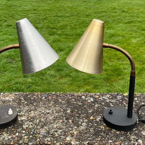 Beigefarvet bordlampe i metal produceret hos E.S. Horn, Aalestrup. Model nr. 401. Højde inklusive fatning: 38,5 cm. Diameter: 21 cm. Fremstår med nogle enkelte små mærker. Men er ellers i pæn stand.