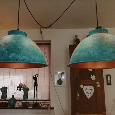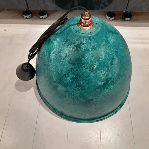 'Boule' Ø40H25 Håndmalet i Irgrøn og turquoise samt patineret kobbereffekt indeni - inkl. 3 m sort tekstilledning samt E27 kobberfatning max 60 watt, samt sort baldakin.