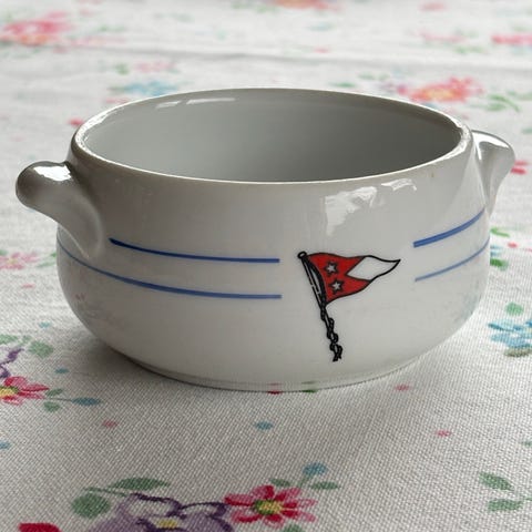 Skål dekoreret med guldkanter og et smukt guldmønster, der omkranser et motiv af et sejlskib og formodentlig Kronborg i baggrunden. Indersiden af skålen er let krakeleret. Skålen er et arvestykke fra begyndelsen af det 19. århundrede eller slutningen af det 18. århundrede. Dia: 28 cm, H: 14 cm.