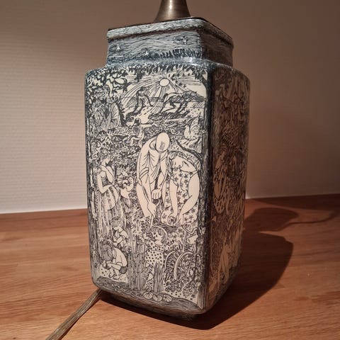 Denne bordlampe er muligvis lavet af vase nr 893/554. Ca 35 cm op til fatningen starter. Denne vasen / lampe har en slags hårrevne i bunden, men hænger fint sammen. Der skal monteres ny ledning, men det er ikke svært. Muligvis Harald Slott-Møller.