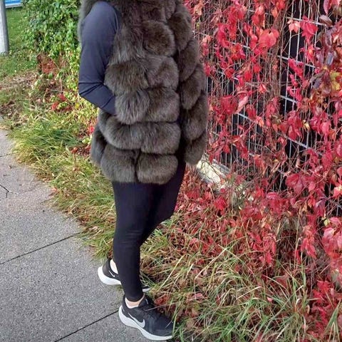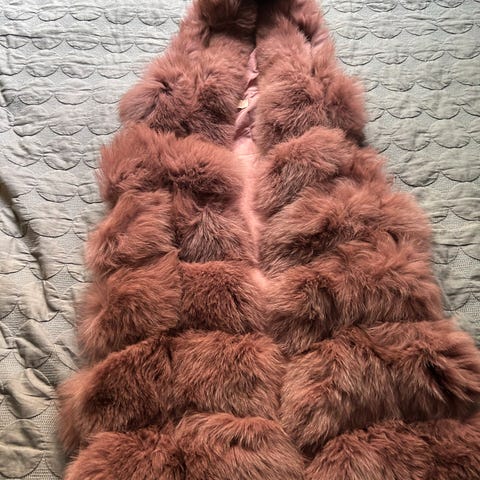 Den er brugt og har nogen steder foran den er nusset “se billederne” pelsen lukkes med hægte, den nederste hægte til lukning mangler i den ene side, “se vedlagte billede.