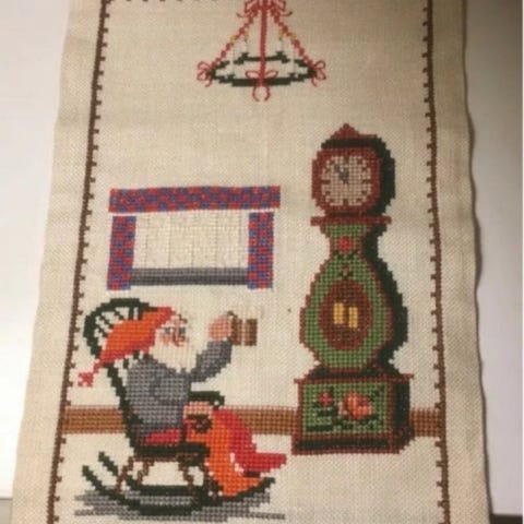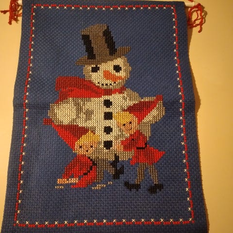 sødt broderet (tror jeg?) vægtæppe med en nisse. Måler 25x32 cm. Jeg har købt det som retro. 50 kr.