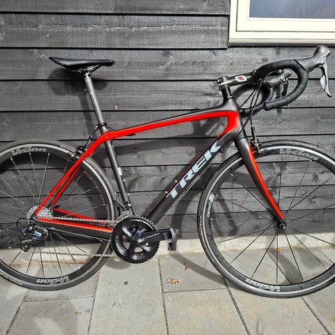Jeg sælger denne trek madone carbon. I stelstørelse 54 cm. Dvs. M. Med lækre dybe aero mavic cosmic hjul (45mm) Med fælgbremser.