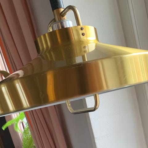 Flot messing lampe, diameter 42cm, højde 46cm inkl bøjle. Sort hejs.