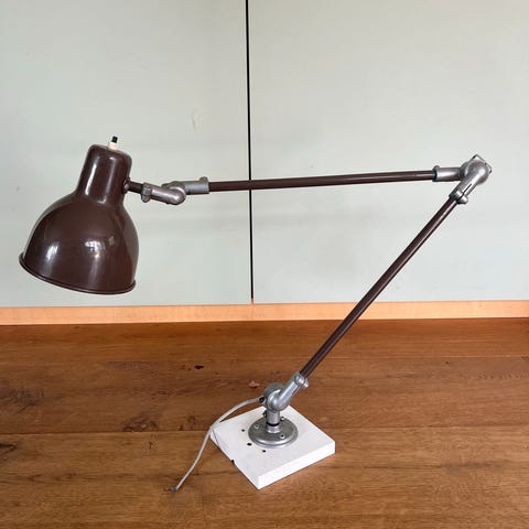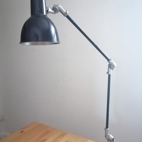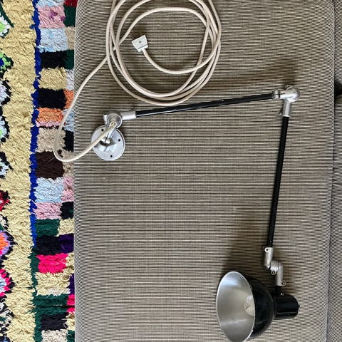 Til venstre ser I en væglampe / industrilampe som skal renoveres, men kan blive funktionel. Resten er reservedele blandt andet til Rijo. Man kan også benytte lampen som bordlampe, men den skal skrues fast.