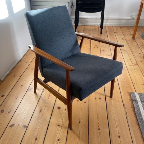 Lænestol, teaktræ, design Kurt Olsen, skal ombetrækkes, ellers pæn.