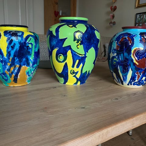 Sælger disse blå krukker og diverse ting, f.eks. mælke kander, snapse flasker, osv.