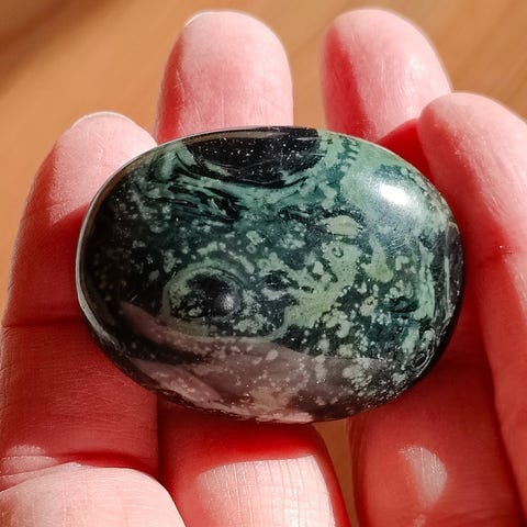 Kambaba Jaspis har en rensende effekt og eliminerer negativ energi og stabiliserer auraen. Det gør den til en ideel bekymringssten som hjælp til at berolig nerverne og mod mareridt. Kambaba Jaspis kan hjælpe til at give en god søvn."