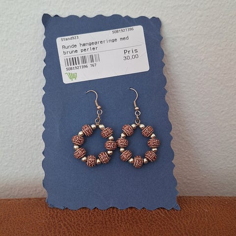 Hængeøreringe med turkisefarvede kugler i bunden. En slags metal, kugler måske plastik, måske ægte sten-ved det ikke. På den ene lukning på indesiden er lidt blålig misfarvning, ellers ok.