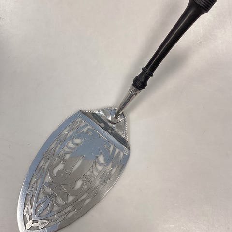 Fiskespade fremstillet af den københavnske guldsmed Sivert Thorsteinsson, borgerskab 1742. Laf med gennembrudt mønster.