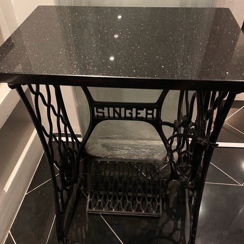 Smukt og charmerende bord lavet af et originalt Singer symaskine-understel i støbejern, kombineret med en massiv træplade i flot stand.