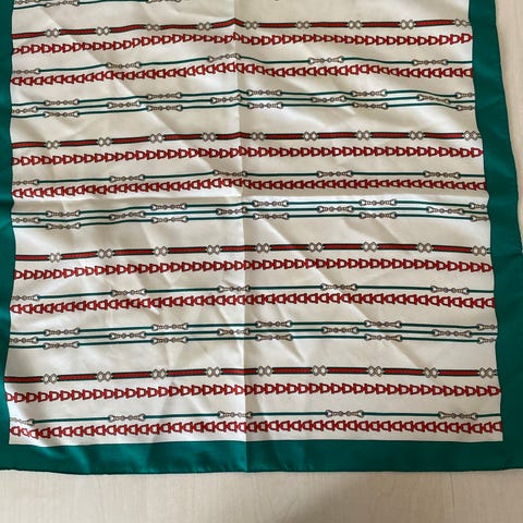 Gråt tørklæde med pastelfarvet ydre og indre rammer samt pastelfarvet blomster/blad tegning. Størrelse 66 x 68 cm. Polyester.