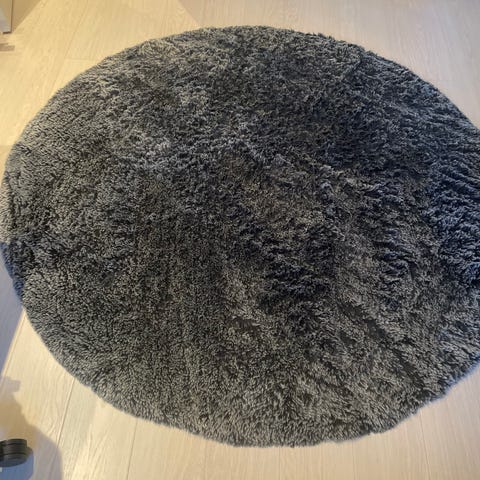 Nyt og ubrugt rundt gulvtæppe i sand/beige/lys grå med skridsikkert underlag. Er kun rullet ud for billedet.