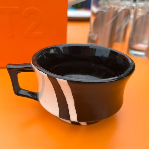 Hvid kop med sorte prikker og stor rund hank.