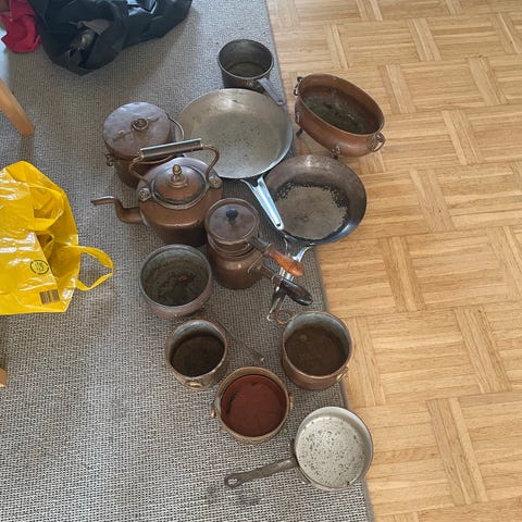 Kedlen i midten samt æbleskivepande og skålen til venstre er tilbage