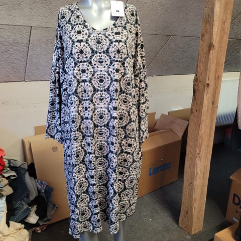Kjole fra Asia i tyndt stof. Mørkeblå og lyseblå med broderi på. 3/4 ærmer med elastik. Etager i det mørkeblå skørt. Med lommer.
