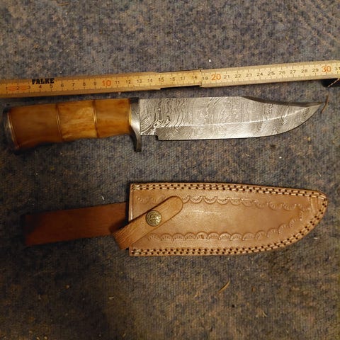 Kvaliteten Japansk jagtkniv udført i rustfrit stål med læder skede. Prisen inkluderer også forsendelse.