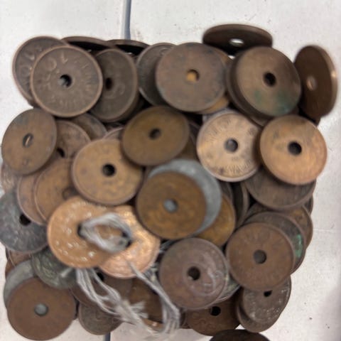 En større samling ældre samt antikke danske mønter samt mindre antal spillemærker. Sandsynligvis omkring 2 kilo. Sælges kun samlet.