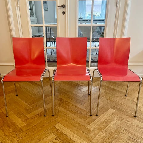 Fire Erik Magnussen chairik. De mega fede enkelte og stilerene spisebordsstole/kontorstole i noget der ligner egetræ. Kom med et bud!