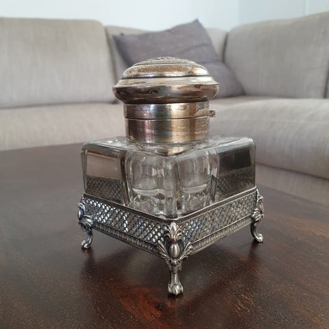 Smukt antikt blækhus i krystalglas med låg i engelsk sterling-sølv (925s).