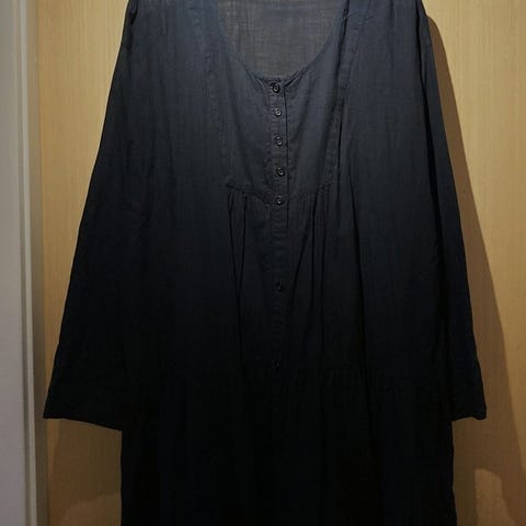 Sød tunika i flot, grøn, farve, med mønster i lysere grøn. Str XXL Brystmål 2 x 66 cm, hel længde 108 cm, ærmelængde 49 cm. 2 indvendige lommer.100 % bomuld. Fra røg og dyrefrit hjem.