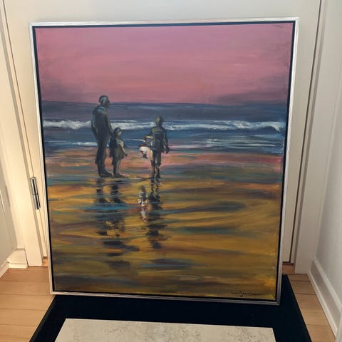 Kunstmaleri indrammet maleri med abstrakt motiv. Maleriet er indrammet i en guldfarvet ramme og viser et abstrakt motiv med dæmpede farver. Velegnet til ophængning i stue eller kontor for at tilføje en kunstnerisk atmosfære.