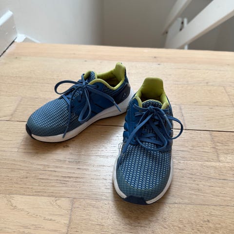 Adidas unisex børnesko i størrelse 30. Skoene er i en blå farve med hvide detaljer og er velegnede til både drenge og piger. De er designet med komfort og stil for øje og passer perfekt til daglig brug.