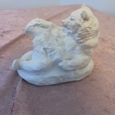 Isbjørn med fisk lavet i gips, derfor den gullige overflade. Kunstner menes at være Gustav Hjortlund. ,Afhentes i:,Røde Kors Aabenraa (546),Bemærk at mail, chat og beskeder ikke besvares, og varen skal købes på knappen "Gå til varen"