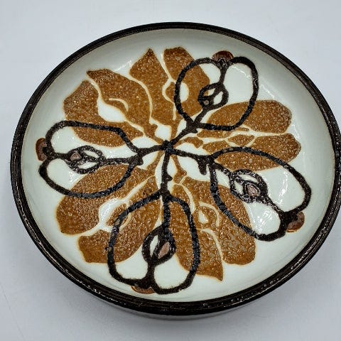 Skålen har et firkantet design med mønstre i blå/grøn/lilla farver fremstillet af keramik.