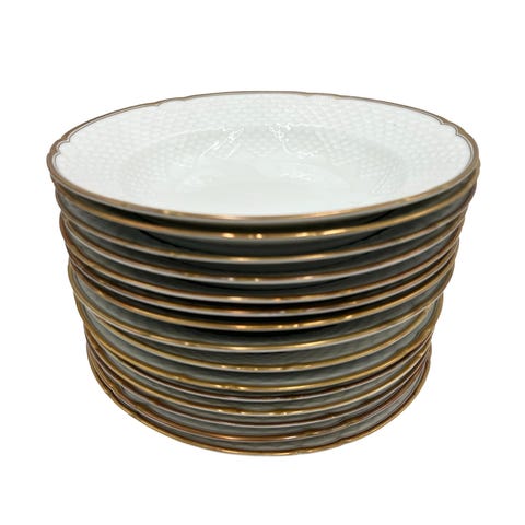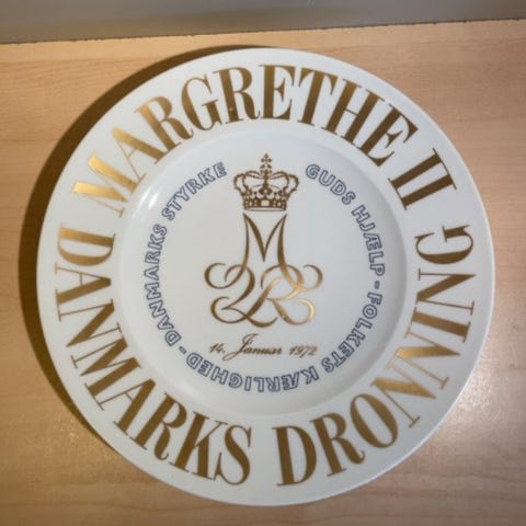 Produktet er en rund tallerken med et klassisk design. Den har en glat, lys overflade med præget tekst og detaljer i guld. Materialet er porcelæn. Tallerkenen viser inskriptioner og et symbol, der relaterer til Margrethe II.