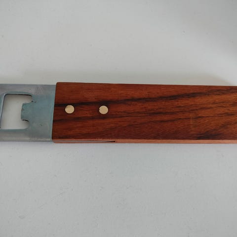 Stor flaskeåbner med en kombination af teak træ og metal. Træet har en mørk og struktureret overflade, mens metalpartiet er i en gylden farve. Der er også to små metalnitter synlige på trædelen.,Afhentes i:,Røde Kors Horsens (615),Bemærk at mail, chat og beskeder ikke besvares, og varen skal købes på knappen "Gå til varen"