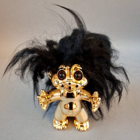 Dukken har sort, strittende hår og store øjne. Den er lavet af plastik med tekstilbukser.,Afhentes i:,Røde Kors Holstebro (661),Bemærk at mail, chat og beskeder ikke besvares, og varen skal købes på knappen "Gå til varen"