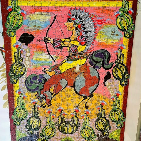 Puslespillet viser en farverig illustration med to figurer i en skov. Det er indrammet i en gullig ramme. Puslespillet er en af bjørn wiinblads tegninger. Her samlet og sat i ramme.,Bemærk at mail, chat og beskeder ikke besvares, og varen skal købes på knappen "Gå til varen"