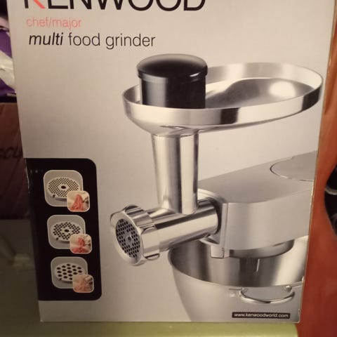 Kenwood kødhakker AT950 er en kvalitets kødhakker. Kassen indeholder 3 hulskiver i fin, mellem og grov, til hakning af fjerkræ, kød, grøntsager, og fisk. Der medfølger også en pølsestopper.,Afhentes i:,Røde Kors Holstebro (661),Bemærk at mail, chat og beskeder ikke besvares, og varen skal købes på knappen "Gå til varen"
