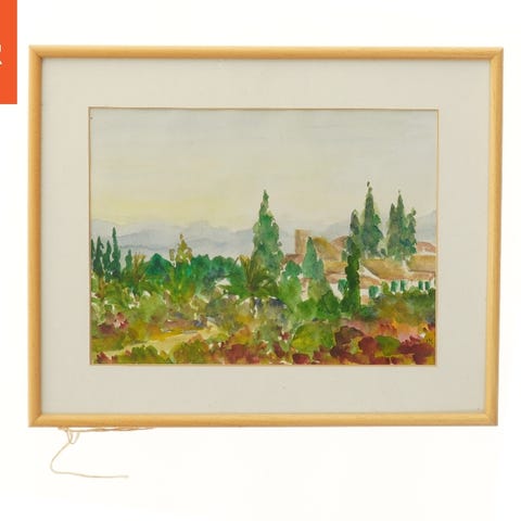 Billedet viser en maleri med en landskabspræsentation, indrammet i en lyst træramme.