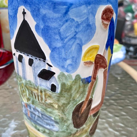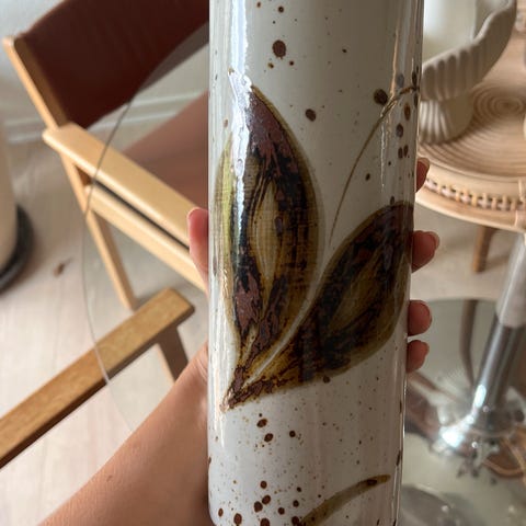 Vasen har en glat, klar overflade med en cylindrisk form og indvendig blå farve. Den har sorte prikker, der tilføjer kontrast.,Afhentes i:,Røde Kors Holstebro (661),Bemærk at mail, chat og beskeder ikke besvares, og varen skal købes på knappen "Gå til varen"