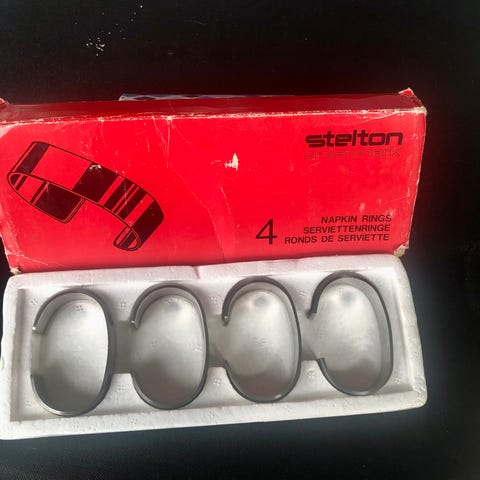 Stelton servietringe m/ reklameinskription på en af ringene - ringen længst til venstre på 1. billede Ny pris uden reklame - 400 kr. ,Afhentes i:,Røde Kors Holstebro (661),Bemærk at mail, chat og beskeder ikke besvares, og varen skal købes på knappen "Gå til varen"