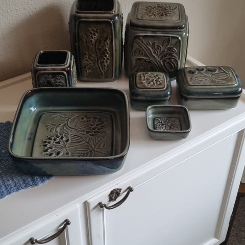 Sættet består af flere porcelænsskåle og tallerkener med blå dekoration.