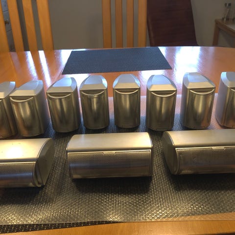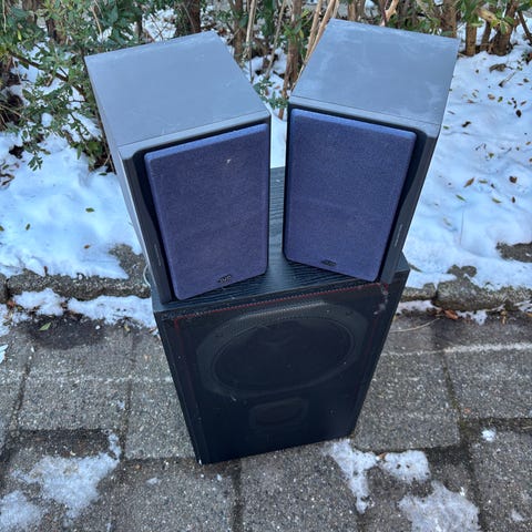 Højtaleren har en firkantet form med tre synlige enheder og et sort net foran. ,Afhentes i:,Røde Kors Kolding (621),Bemærk at mail, chat og beskeder ikke besvares, og varen skal købes på knappen "Gå til varen"