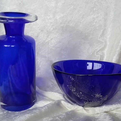 Produkterne er i blå glas og inkluderer forskellige skåle og vaser.