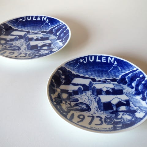 Finsk kunstner Seppo Martinsen Kunstner platte Jul 1973 Motiv Juleland skab blå hvid Diameter 20 cm ,Afhentes i:,Røde Kors Østbirk (609),Bemærk at mail, chat og beskeder ikke besvares, og varen skal købes på knappen "Gå til varen"