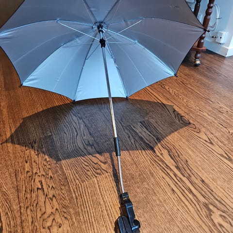 Parasollen er sammenklappelig med et metal stykke så man kan rette parasollen og et plastik stykke så den kan sættes på enten barnevogn eller klapvogn,Afhentes i:,Røde Kors Holstebro (661),Bemærk at mail, chat og beskeder ikke besvares, og varen skal købes på knappen "Gå til varen"