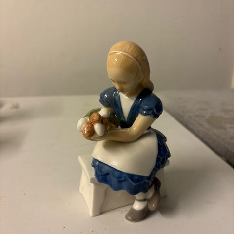 Figuren forestiller en lille pige, der læser i en bog. Hun har en blå kjole med hvidt krave, og materialet ser ud til at være porcelæn med en glat overflade. Det giver et delikat og elegant udtryk. Hendes ansigt er detaljeret, og bogen har illustrationer i grålig nuancer.,Afhentes i:,Røde Kors Sorø (335),Bemærk at mail, chat og beskeder ikke besvares, og varen skal købes på knappen "Gå til varen"