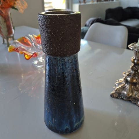 Vasen har en rund form med en smal åbning. Den er dekoreret med håndmalede motiver af bygninger og landskab. Materialet ser ud til at være keramik, og den har en glasur, der giver en glansfuld overflade. Bornholm Michael Andersen, model 5874. Krakeleret glasur.,Afhentes i:,Røde Kors Aabenraa (546),Bemærk at mail, chat og beskeder ikke besvares, og varen skal købes på knappen "Gå til varen"