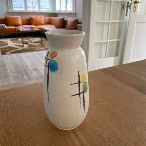 Vasen har en rund form med en smal åbning og en matte overflade. Den har en indgraveret tekst.,Afhentes i:,Røde Kors Tuborgvej / København NV (101),Bemærk at mail, chat og beskeder ikke besvares, og varen skal købes på knappen "Gå til varen"